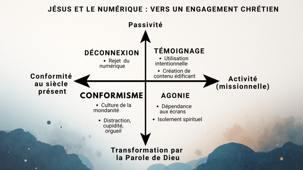 Comme l’illustre la figure suivante, l’heure n’est ni au conformisme ni à la passivité, mais à un engagement chrétien authentique et à une transformation radicale par la Parole de Dieu.
